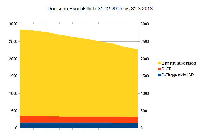 Die deutsche Handelsflotte ist in den vergangenen zwölf Monaten ungebremst weitergeschrumpft. Beim Ausflaggen hat sich hingegen die Seitwärtsbewegung fortgesetzt. Nach Berechnungen des Verkehrsbriefs auf Basis von Zahlen des Bundesamtes für Seeschifffahrt und Hydrographie (BSH) ging die Zahl der Schiffe bis Ende März um 11,8 Prozent auf jetzt 2274 zurück, die Tonnage schrumpfte sogar um 13,9 Prozent auf rund 57.000.000 BRZ. Die Zahl der im internationalen Schiffsregister ISR registrierten Schiffe unter deutscher Flagge schrumpfte im Zwölfmonatsvergleich zwar von 184 auf 178 Einheiten; zwischenzeitlich lag sie aber auch darunter. Insgesamt fuhren Ende März noch 317 Schiffe unter deutscher Flagge, 16 weniger als ein Jahr zuvor.