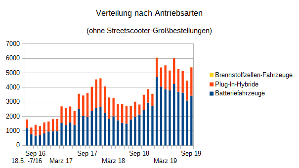 Einen merklichen Antragszuwachs gab es für Plug-In-Hybride. Gegenüber Juni/Juli stieg die Anzahl der Anträge von rund 1500 auf 1950 im September oder von rund 30 Prozent auf 36 Prozent (Streetscooter-Sondereffekte herausgerechnet). Hier wirkt sich offenbar aus, dass es nach dem faktischen Produktionsstopp für viele Modelle nach der Einführung des WLTP-Emissionsmessverfahrens im September 2018 jetzt wieder mehr Angebote der Hersteller gibt. (roe)