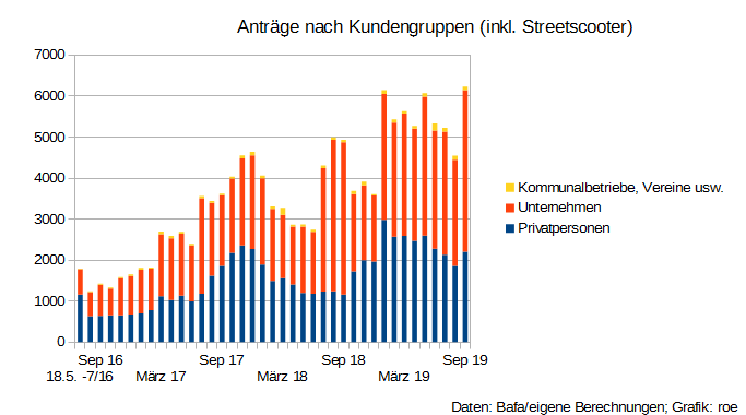 Die Verteilung der Anträge auf die einzelnen Kundengruppen blieb – nach Herausrechnen der Streetscooter-Sondereffekte – gegenüber den Vormonaten praktisch unverändert. Auf Privatkunden entfielen rund 41 Prozent, auf Unternehmen 58 Prozent und auf kommunale Betriebe, Körperschaften und Vereine rund 1 Prozent.