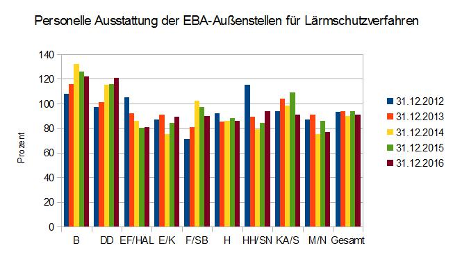 Gerade im bahnlärmgeplagten Mittelrheinkorridor war im mittelfristigen Durchschnitt mehr als ein Zehntel der planmäßigen Stellen nicht besetzt: Der Außenstelle Essen/Köln fehlten fast 15 Prozent zum Soll und Frankfurt/Saarbrücken knapp 12 Prozent. Auf knapp 100 Prozent kommt immerhin die Außenstelle Karlsruhe/Stuttgart.